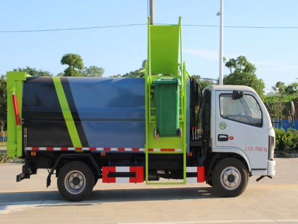 2、提升機構將垃圾標準桶提升**車頂以后,再通過翻料機構將桶內的餐廚垃圾倒入車廂內。標準桶再通過提升裝置送回地面;